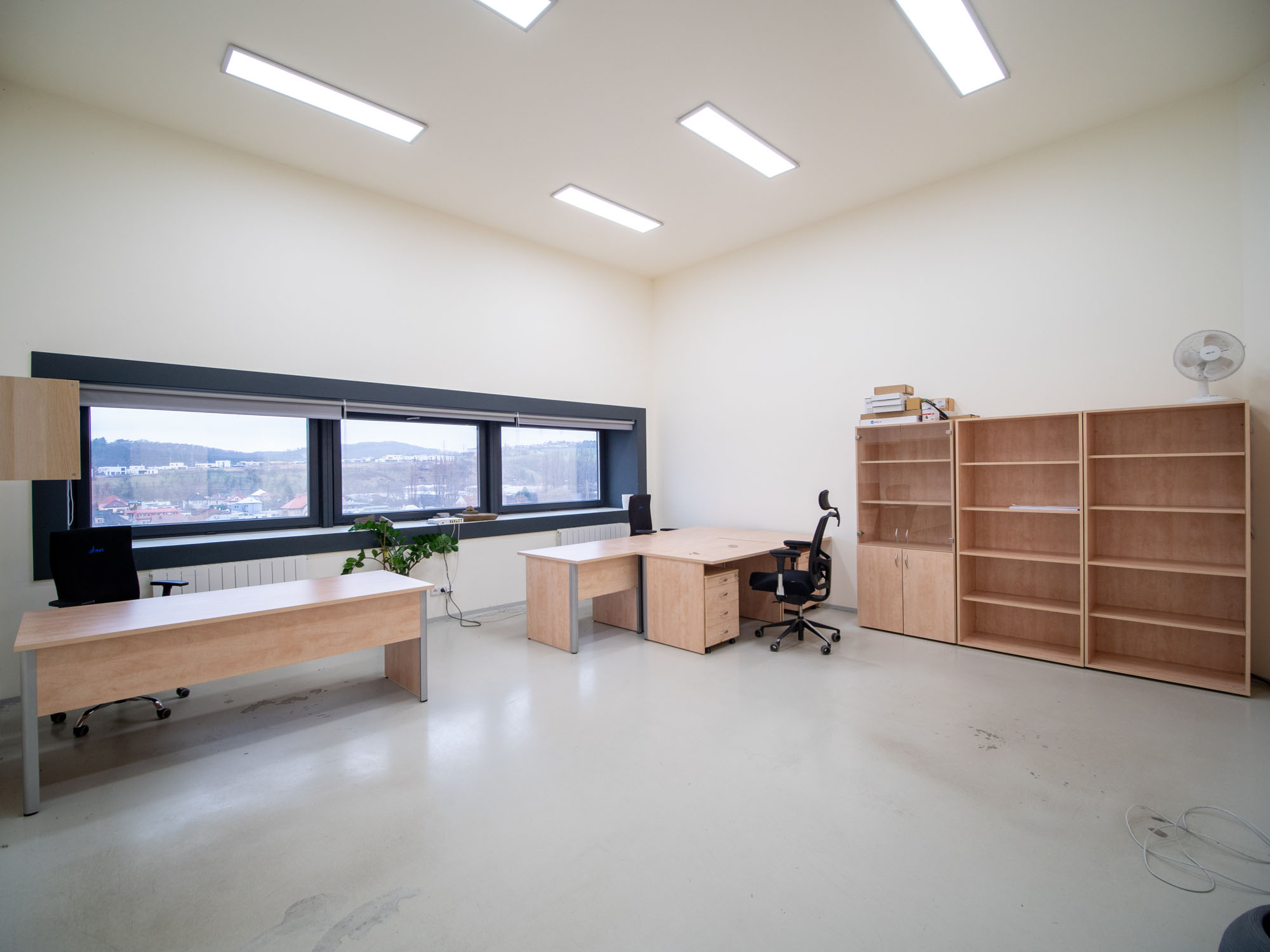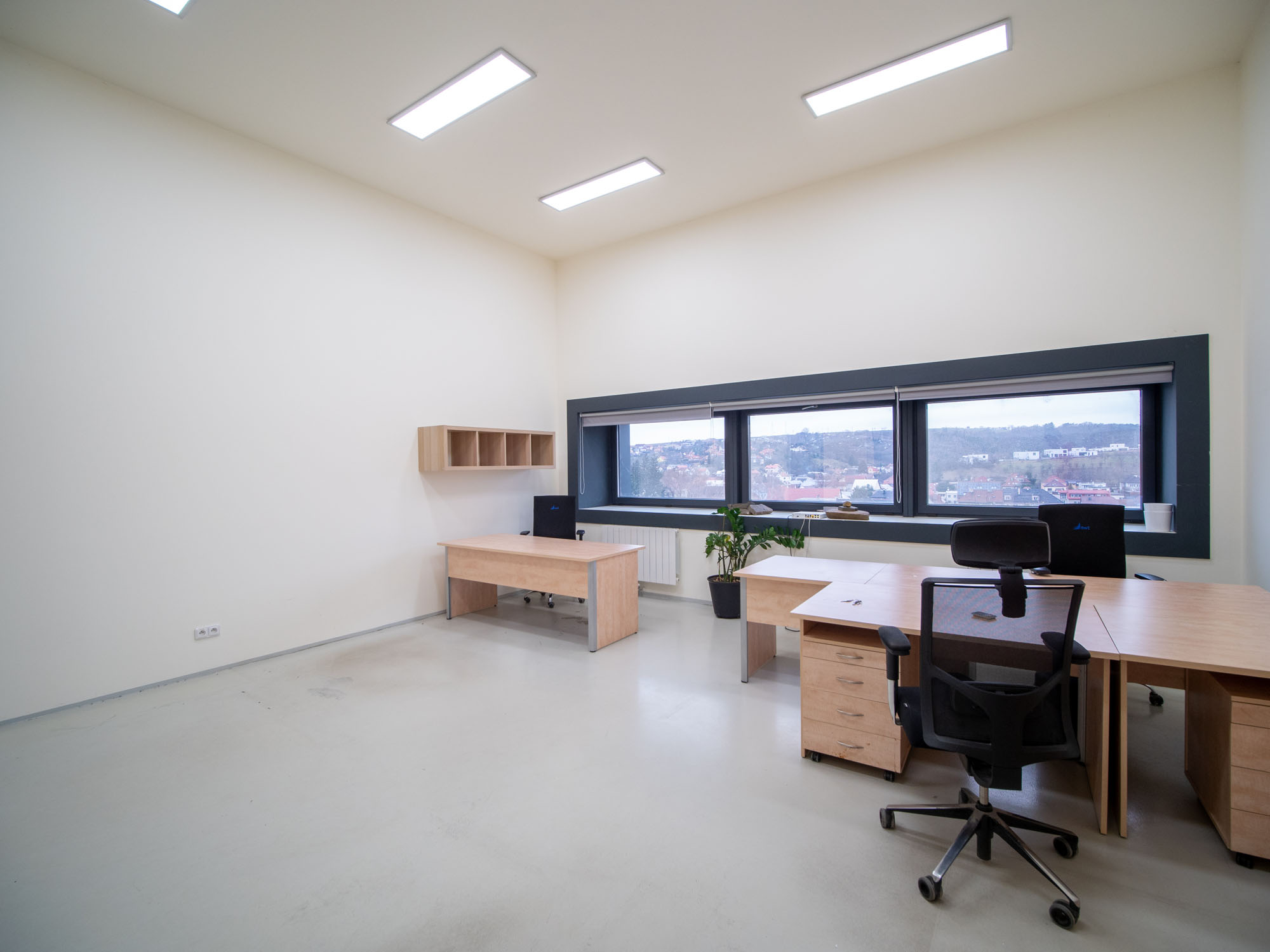 Místnost má tři okna, klimatizace je součástí vybavení kanceláře.